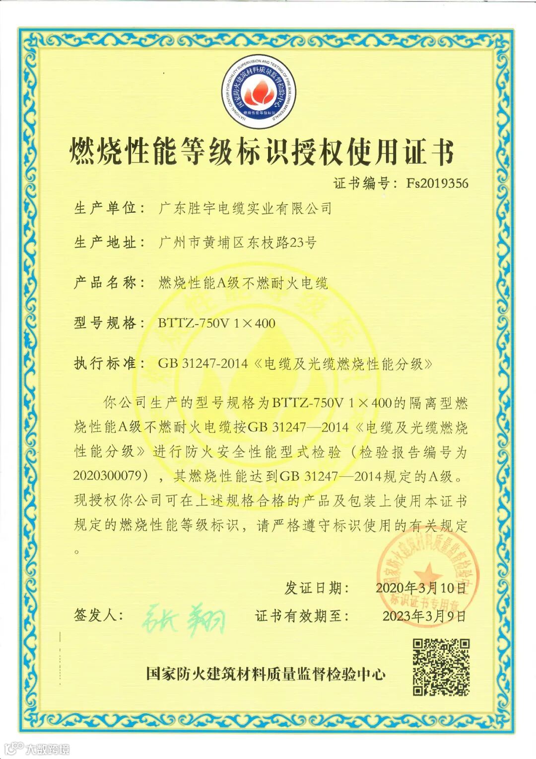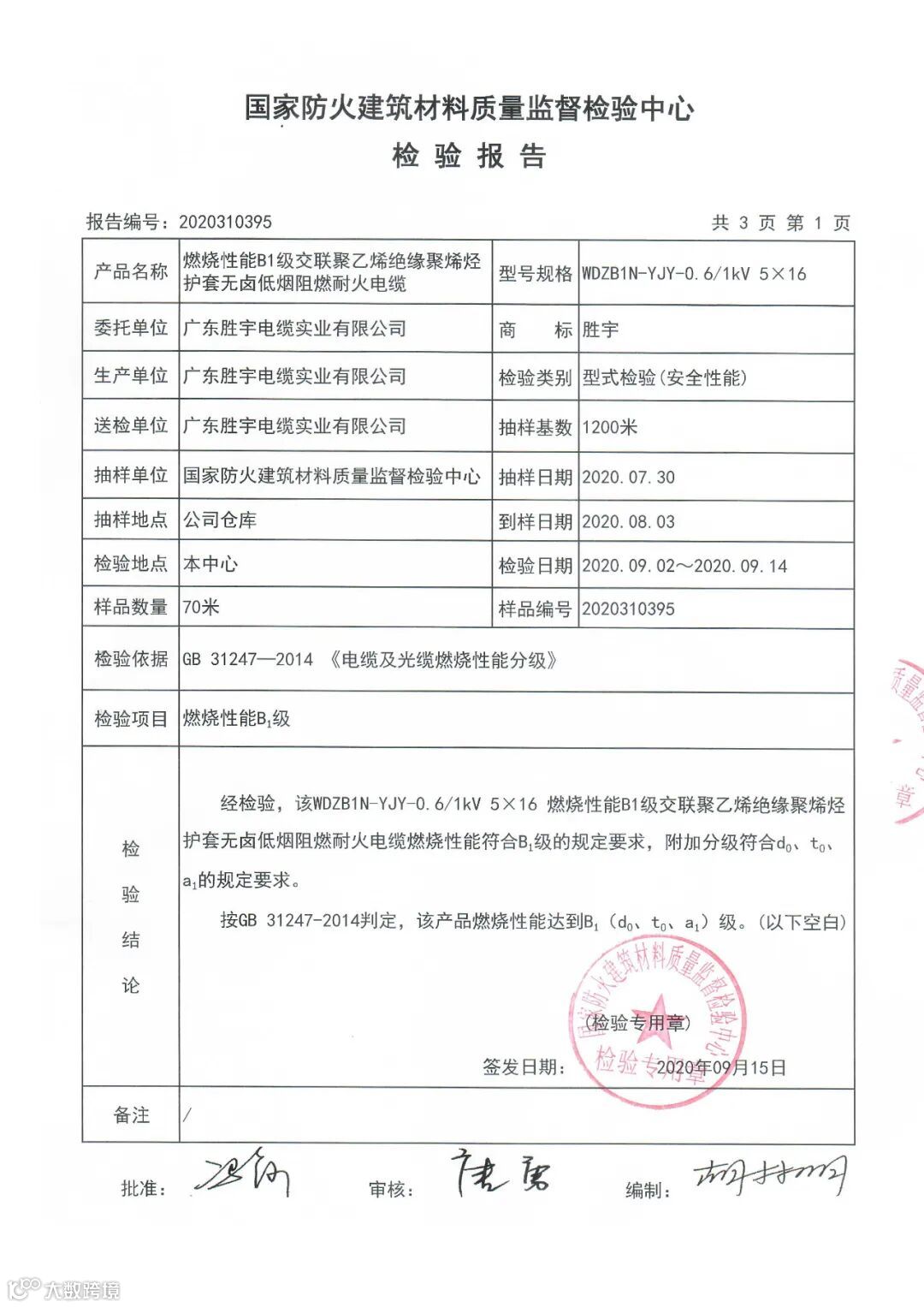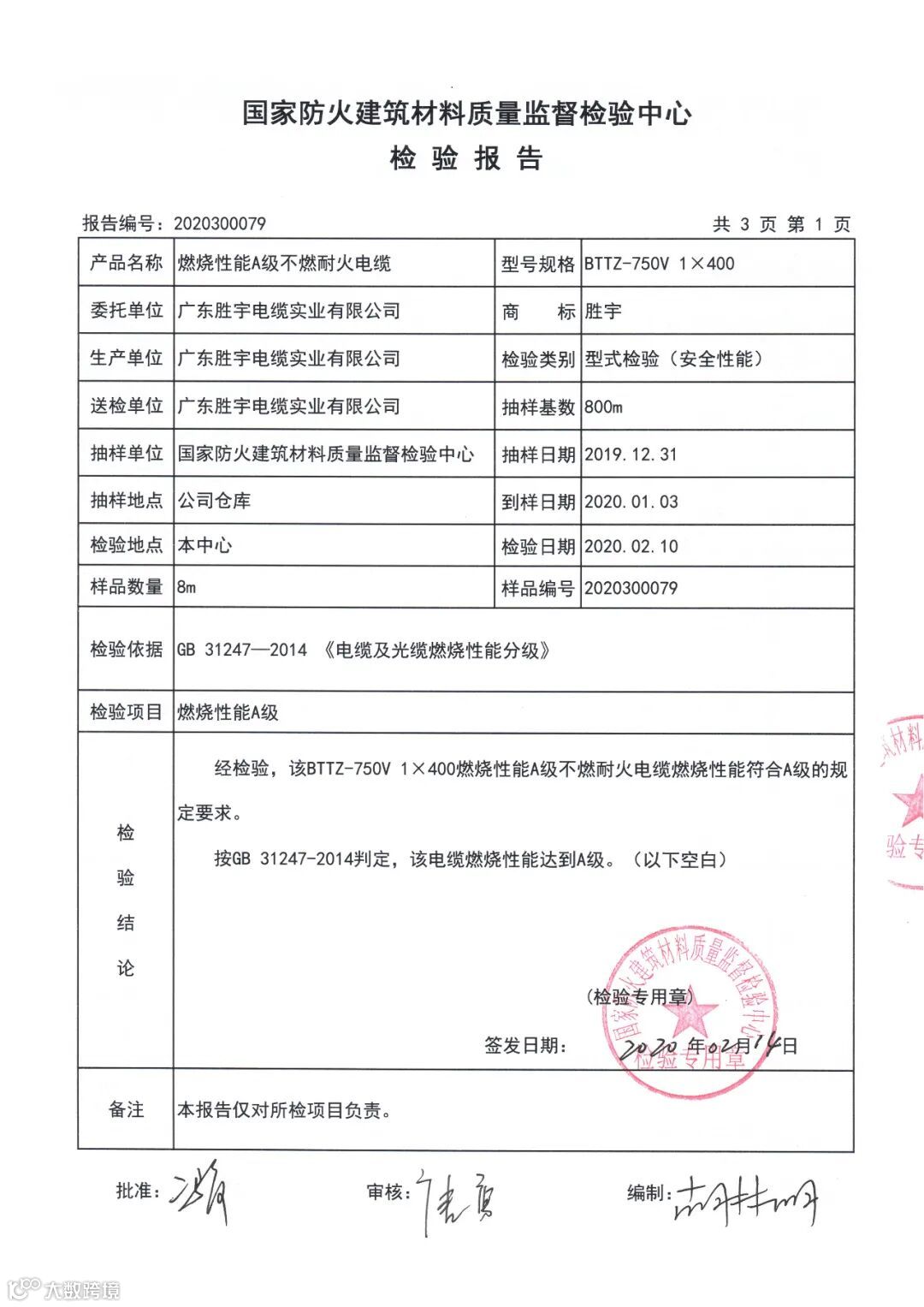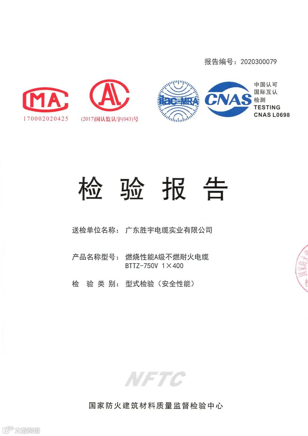 近日,胜宇电缆BTTZ和WDZB1N-YJY分别通过国家防火建筑材料质量监督检验中心GB/T 31247-2014标准燃烧性能A级和B1级检测。