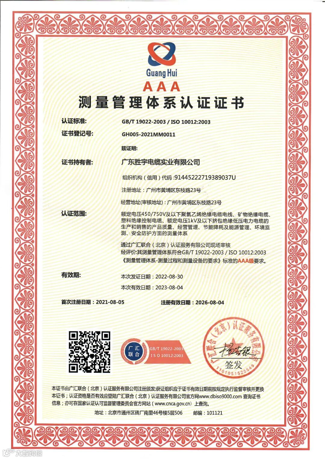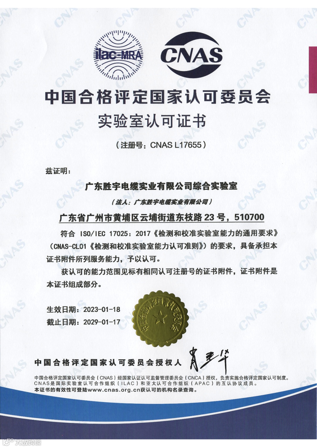 随着各领域对线缆产品需求的日益提升,胜宇电缆在大力开发各类高性能线缆的同时,不断提高产品质量要求,严把质量关,坚守产品品质,经过长期的积累,广东胜宇电缆实业有限公司综合实验室于2023年1月18日获得中国合格评定国家认可委员会(简称CNAS)颁发的国家级实验室认可证书。