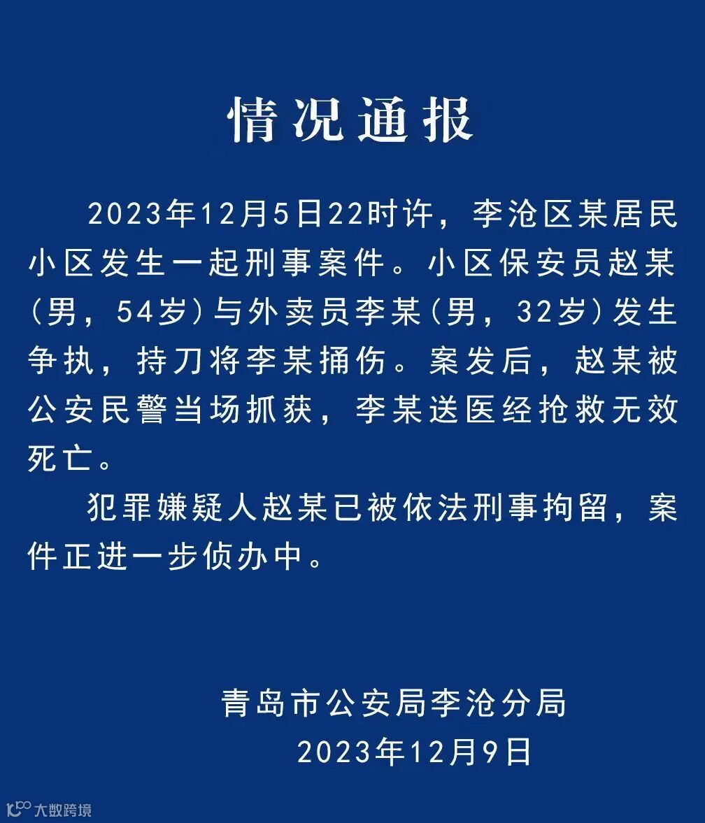 9日,青岛市公安局李沧分局发布情况通报:12月5日22时许,李沧区某居民小区发生一起刑事案件。小区保安员赵某(男,54岁)与外卖员李某(男,32岁)发生争执,持刀将李某捅伤。