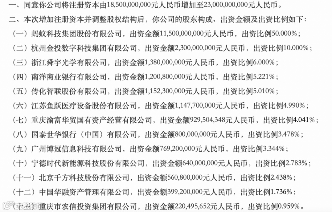 今年10月25日,国家金融监督管理总局重庆监管局官网发布《关于同意重庆蚂蚁消费金融有限公司增加注册资本及调整股权结构的批复》显示,经审核批复,同意重庆蚂蚁消费金融有限公司(即“蚂蚁消金”)将注册资本由185亿元人民币增加至230亿元人民币。
