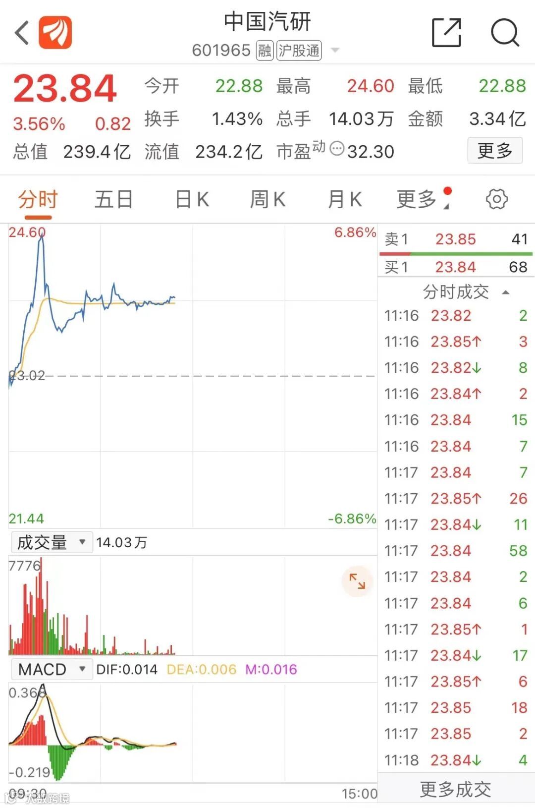 中国汽研早盘一度上涨超6%,截至发稿,中国汽研报23.84元/股,上涨3.56%。