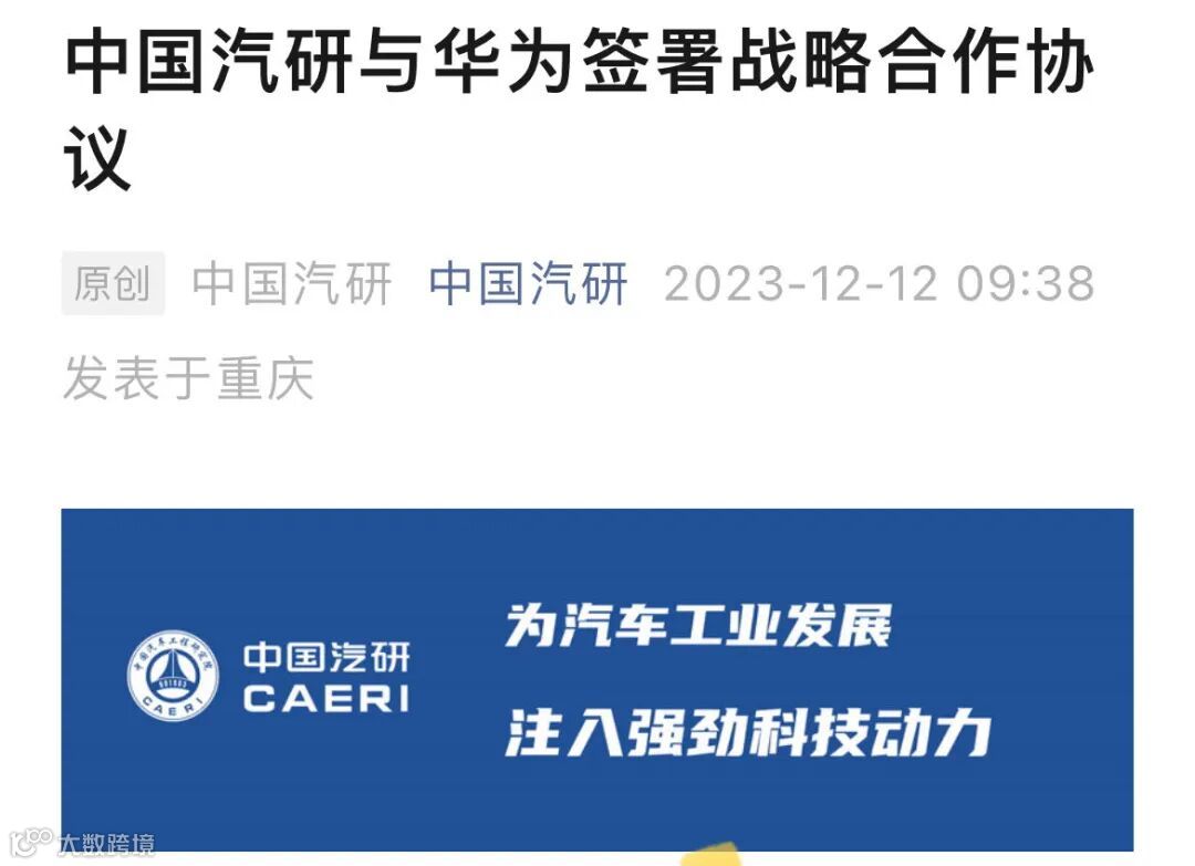 12月12日,据中国汽研官微消息,华为与中国汽研签署了战略合作协议。