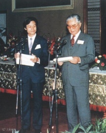 1988年11月11日,荣毅仁先生(右)在开业招待会上致辞