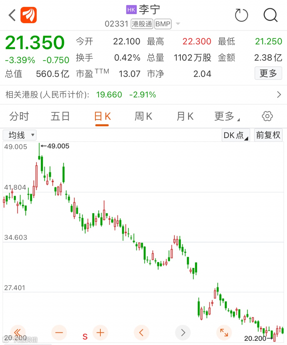 在二级市场层面,李宁的股价变现并不尽如人意。截至最新收盘,李宁股价报21.35港元,年内累计跌幅达68%,总市值缩水至560.6亿港元,仅为安踏总市值的25%。