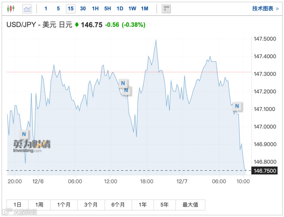 与此同时,日元兑美元汇率短线拉升,一度升至146.75。