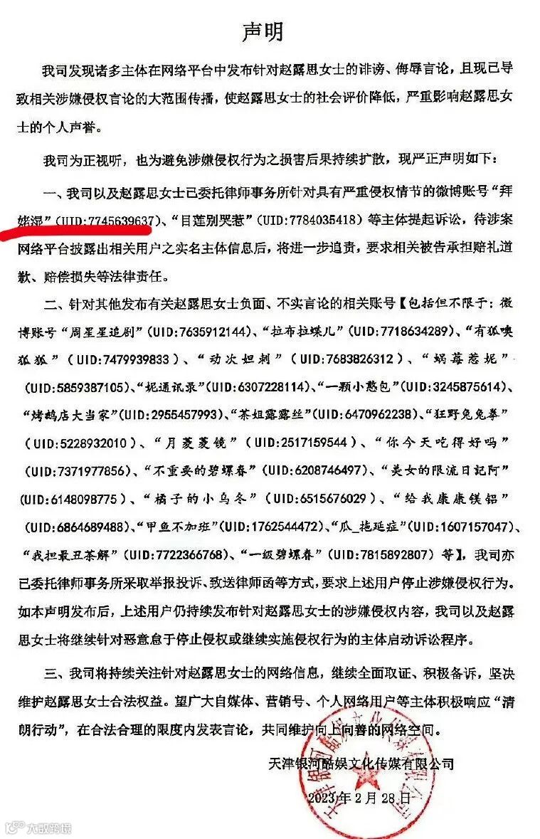 该网友晒出的图片显示:天津银河酷娱文化传媒有限公司以及赵露思女士,于2023年2月28日委托律师事务所针对具有严重侵权情节的多个微博账号主体提起诉讼,赵露思方起诉该网友具有严重侵权行为。