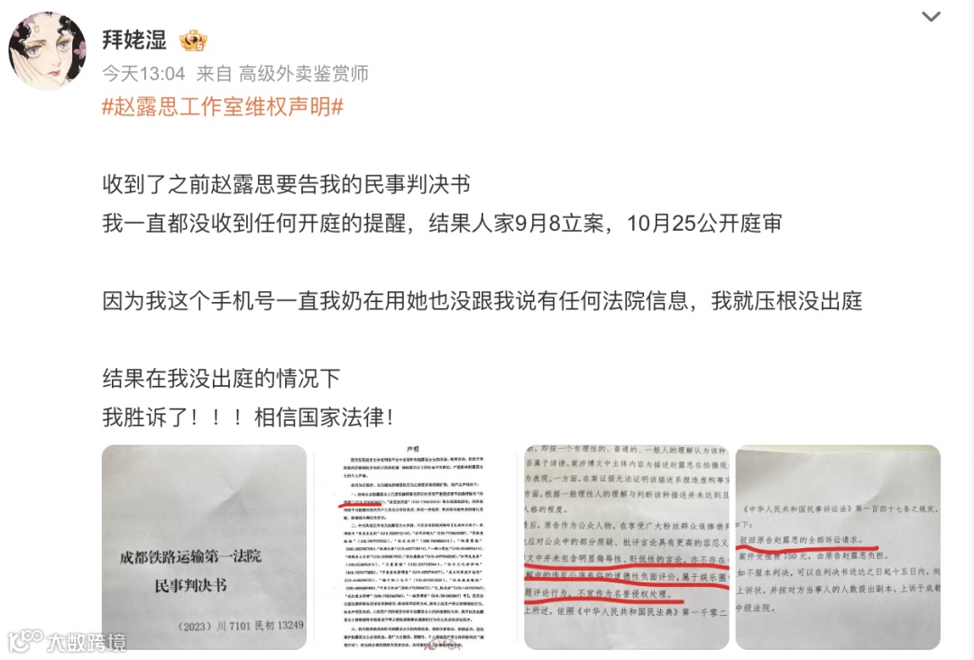 今天,有网友晒出赵露思起诉自己的民事判决书,并发文称:“终于收到了之前赵露思要告我的民事判决书。因为我这个手机号一直是我奶奶在用,她也没跟我说有任何法院信息,我就没出庭。结果我胜诉了!相信国家法律!”