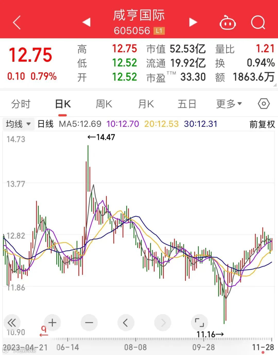 截至11月28日收盘,咸亨国际股价涨0.79%,收报12.75元,总市值52.5亿元。三季报显示,公司前三季度的营业收入为16.74亿元,同比增长35.99%;净利润为6095万元,大幅下滑44.63%。