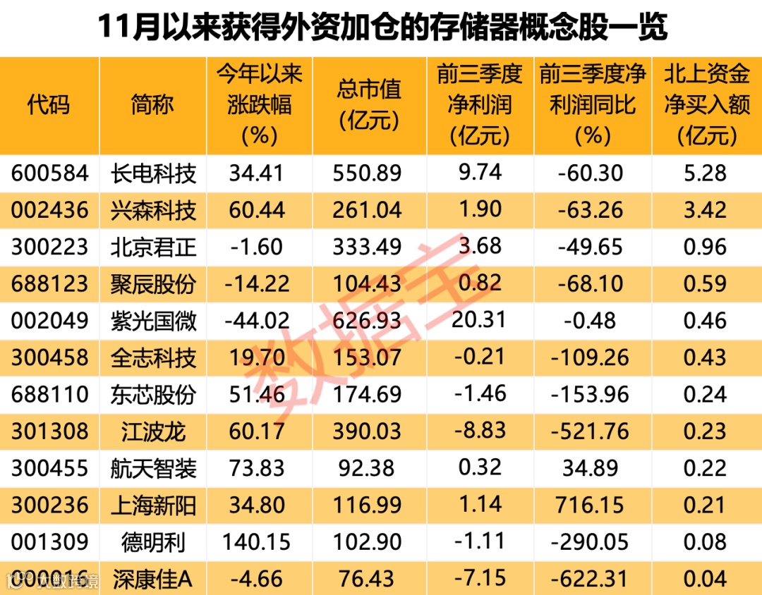 资金面来看,11月以来,超半数的存储器概念股获得北上资金加仓。长电科技、兴森科技分别获得5.28亿元和3.42亿元的北上资金净买入,还有北京君正、聚辰股份、紫光国微、全志科技的北上资金净买入额居前。