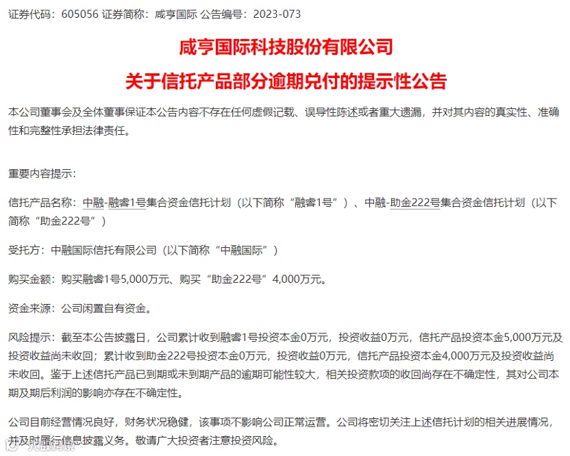 早在今年8月份,咸亨国际曾经公告有多只信托产品逾期未能兑付,如今又遭遇信托产品兑付问题。