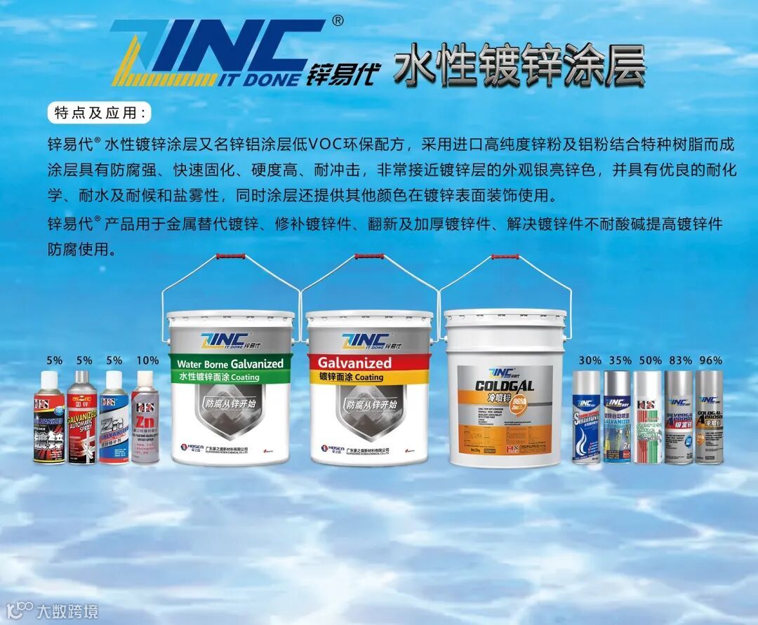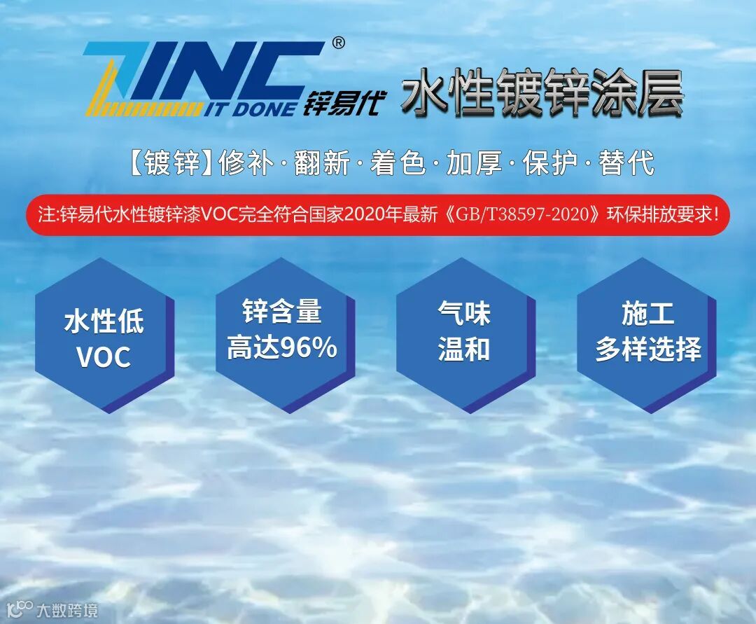 水性镀锌涂层,又名锌铝涂层,低VOC环保配方,采用进口高纯度锌粉及铝粉结合特种树脂而成,具有防腐强、硬度高、耐冲击等特点,非常解决镀锌层的外观银亮锌色,并具有优良的耐化学、耐水及耐候和盐雾性,同时涂层还提供其他颜色再镀锌表面装饰使用。