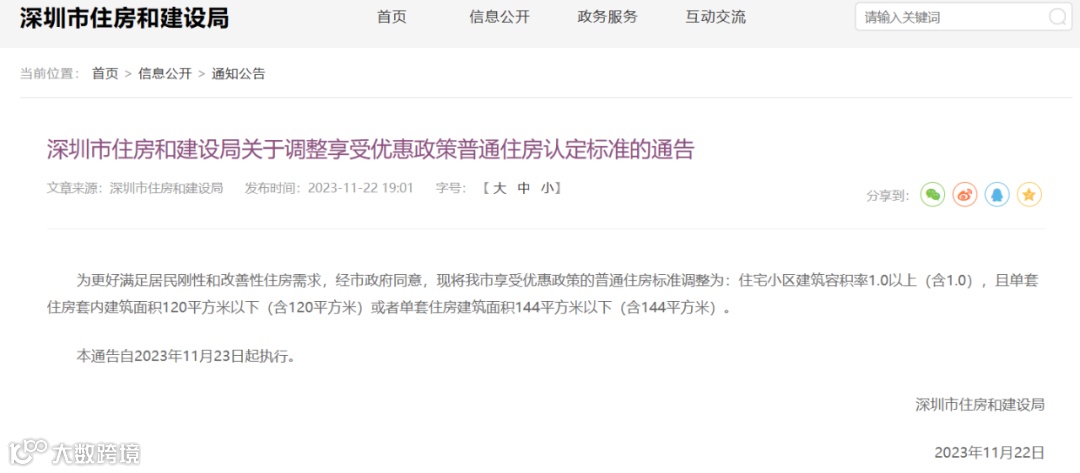 11月22日,深圳住建局发布《关于调整享受优惠政策普通住房认定标准的通告》。