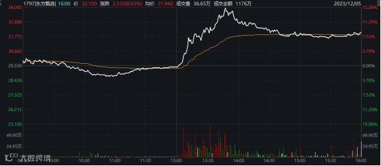 受此影响,12月5日,东方甄选(01797.HK)股价盘中大涨。Wind行情数据显示,东方甄选盘中最高涨幅超过15%。截至收盘,涨8.63%,报32.1港元,市值326亿港元。