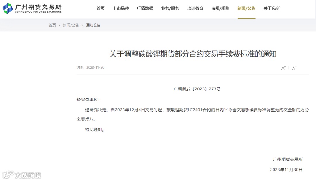 此外,针对近日碳酸锂期货持续大幅下跌的情况,广期所也有出手。11月30日,广期所最新公告称,经研究决定,自2023年12月4日交易时起,碳酸锂期货LC2401合约的日内平今仓交易手续费标准调整为成交金额的万分之零点八。