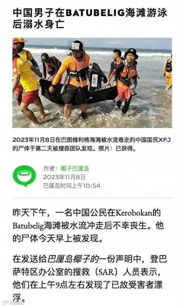 印度尼西亚当地时间11月8日,一名姓名缩写为XFJ的中国男性被发现在海滩游泳时溺亡。有网友猜测,该男子是国内知名网红仲尼,因其姓名缩写及年龄与报道相仿。