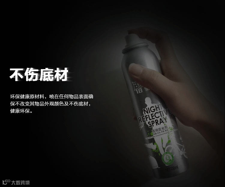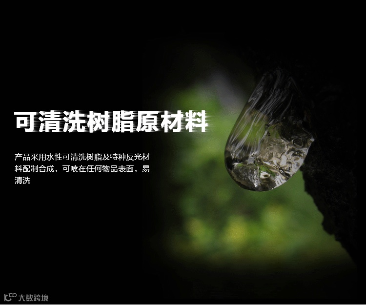 采用水性可清洗树脂及特种反光材料配制合成.可喷在任何物品表面,不改变其物品外观颜色及不伤底材,喷层夜间遇光时产生极佳的反光效果,因而可加强行动的人体在夜间视线不良或危急境况中的可见度,增强安全性而避免发生意外。