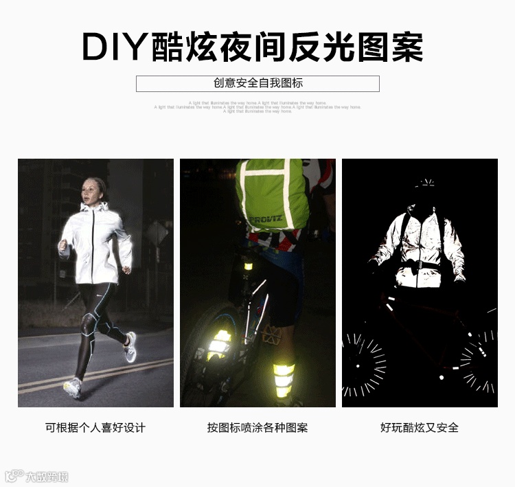 适用范围:任何物品表面作反光安全提示使用(跑鞋、自行车、头盔、衣服、帽子、手套、背包等物品表面)。
