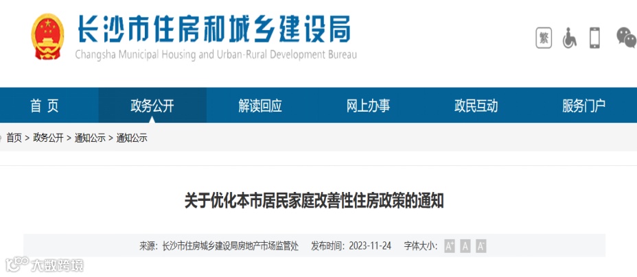 11月24日,长沙市住建局发布《关于优化本市居民家庭改善性住房政策的通知》。