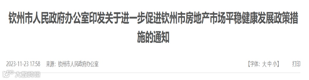 11月24日,钦州市印发《关于进一步促进钦州市房地产市场平稳健康发展政策措施的通知》。