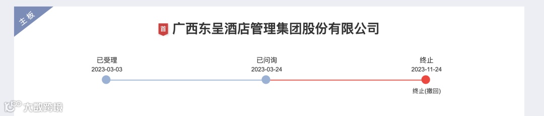 11月24日晚间,深交所官网显示,广西东呈酒店管理集团股份有限公司(简称“东呈集团”)IPO处于终止状态。深交所表示,东呈集团申请撤回发行上市申请文件,根据规定,决定终止对其首次公开发行股票并在主板上市的审核。