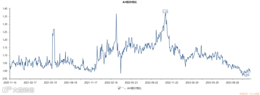 据Choice数据显示,A股上市公司股价通常会享受比H股更高的溢价,即A股价格除以H股的价格比都大于1、溢价率为正。这种情况目前仍然存在,但今年三季度以来有所收缩,主要由于南向资金净买入港股,而A股又在阶段性触底过程中,两者之间的价差变小。