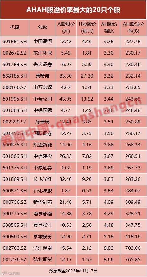AH股价差最大的个股是弘业期货,截至11月17日,A股收盘价为12.17元,当日成交额2873万元;H股收盘价1.4港元,当天成交额64.95万,折合人民币之后AH股溢价率仍达到765.85%。