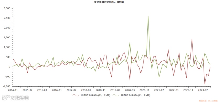 相对而言,港股的性价比开始凸显,比A股更吸引跨境资金,资金呈现南下的趋势。不过这种估值带来的净买入方向背离正在变为趋同,目前沪/深股通净卖出的金额逐渐变小,深股通北向资金已在11月变为净买入,港股南向资金净买入金额也在变小。