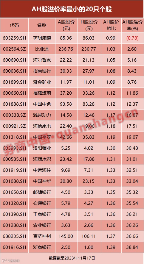 出现类似情况的还有比亚迪股份,去年11月10日比亚迪股份A股价格是H股的1.58倍,溢价率高达58%,今年以来逐渐缩小直至今年11月16日价差只有2.6%。