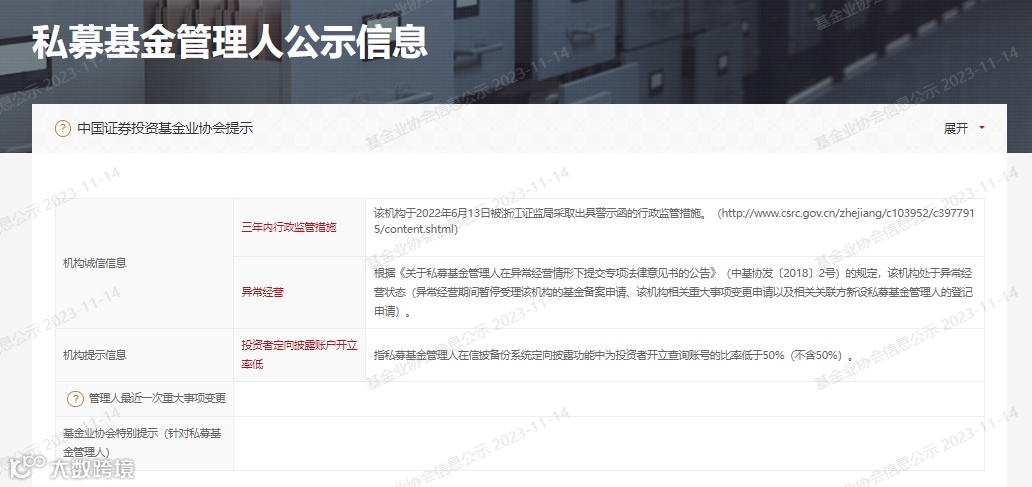 券商中国记者进一步了解后发现,出事私募包括“深圳汇盛私募证券基金管理有限公司”、“杭州瑜瑶投资管理有限公司”等多家公司。基金业协会网站信息显示,深圳汇盛管理规模为10-20亿元,实际办公地在杭州;杭州瑜瑶管理规模为20-50亿元,去年6月13日曾被浙江证监局采取出具警示函的行政监管措施,已被判定为异常经营。