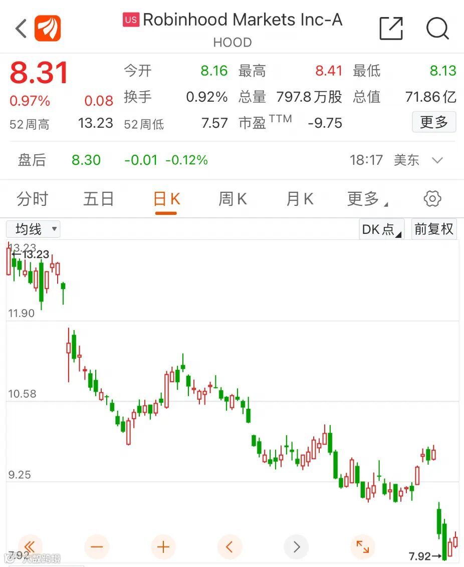 受此影响,Robinhood股价持续走低,截至最新收盘,Robinhood股价报8.31美元,较今年7月最高点,累计跌幅超37%,最新总市值为71.86亿美元(约合人民币525亿元)。