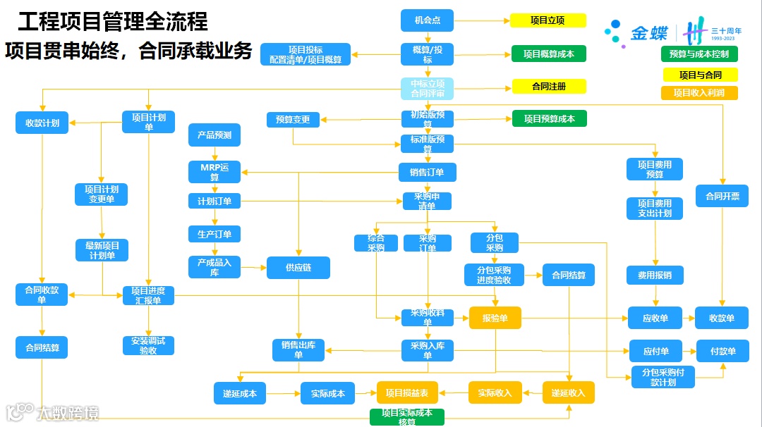 金蝶工程项目管理云不仅把工程项目管理与销售、采购等供应链业务打通,还与成本、收入、收款等财务环节实现端到端的闭环管理,为环保行业提供了全流程服务的一体化平台。