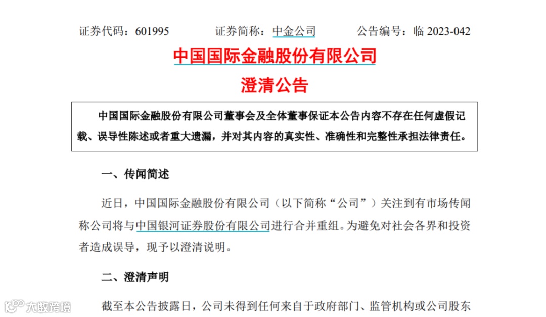 今日早间,中金公司发布澄清公告称,近日,公司关注到有市场传闻称,公司将与银河证券进行合并重组。为避免对社会各界和投资者造成误导,现予以澄清说明。