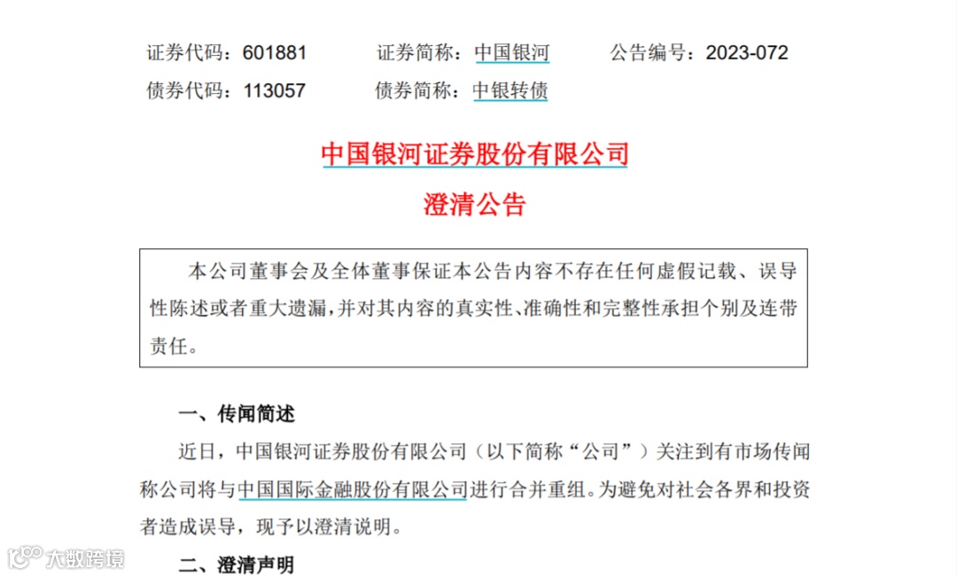 与此同时,银河证券也发布了澄清公告。银河证券表示,近日,公司关注到有市场传闻称公司将与中金公司进行合并重组。为避免对社会各界和投资者造成误导,现予以澄清说明。