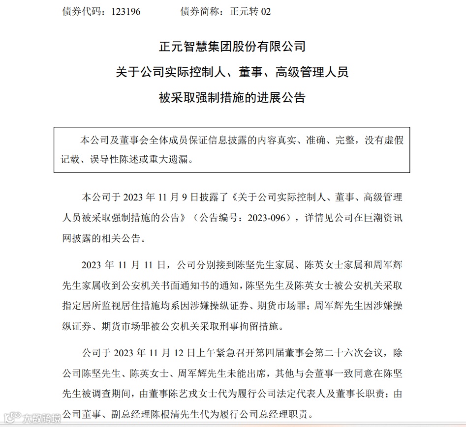 11月9日,正元智慧公告透露,当日收到公司实际控制人、董事长兼总经理陈坚家属的通知,陈坚被公安机关采取指定居所监视居住措施;收到公司董事陈英家属通知,陈英被公安机关采取指定居所监视居住措施;收到公司董事、副总经理兼董事会秘书周军辉家属通知,周军辉被公安机关采取刑事强制措施。