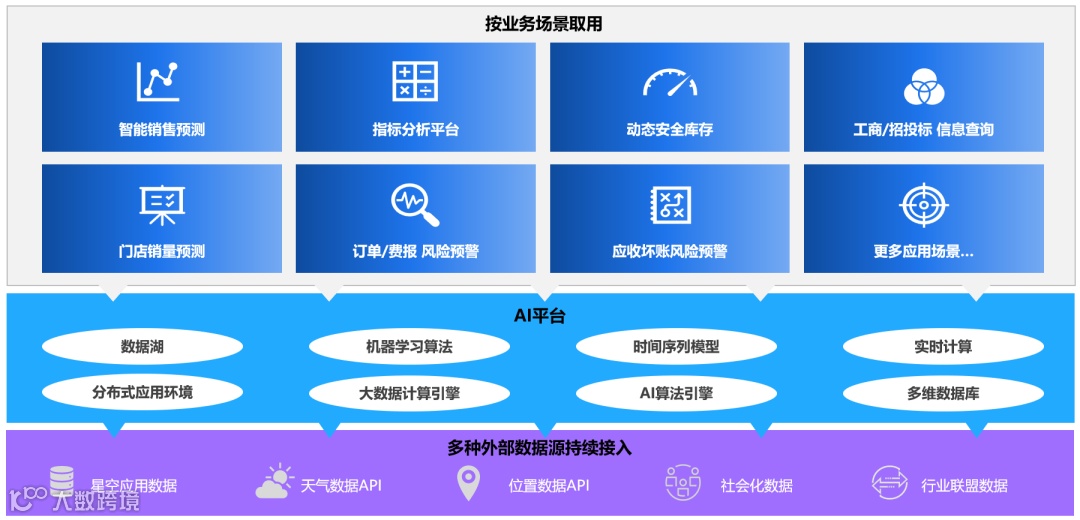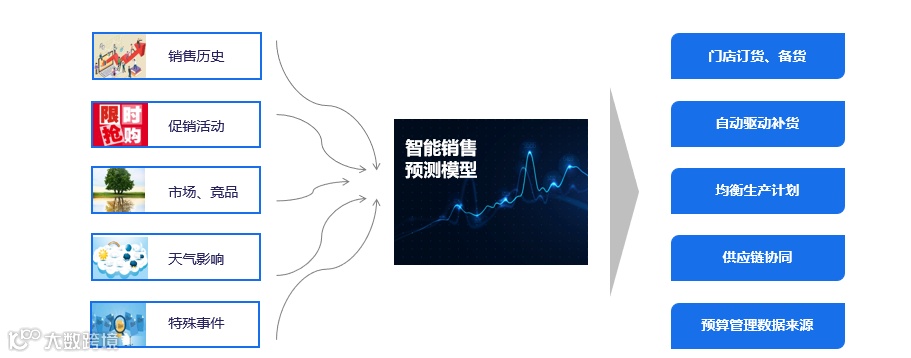 预测的能力,在之前云计算没有普及的情况下,算力是影响最大的一个因素,一般预测很难做到。但目前算力的问题已经不存在了,我们可以利用企业历史销售数据,再加上一些重要的影响因素,比如:促销活动,天气,气候,特殊事件等等,通过内置了大量的机器学习算法和成熟模型,为企业提供比较精准的预测数据,进行补货备货,做好供应链的协同,降低企业库存,提升企业效率。