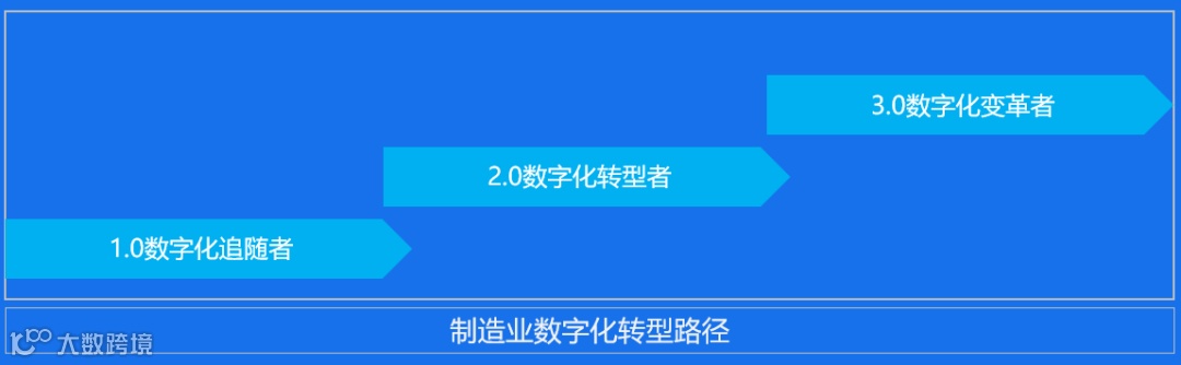 制造企业数字化转型无论从业务创新还是技术落地上,都不是一蹴而就的事情,企业应该长远规划,布局未来,稳站稳打走好每一步。参考阿里研究院的观点,制造企业数字化转型路径分为三个阶段:数字化追随者、数字化转型者与数字化变革者。