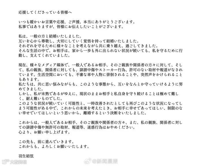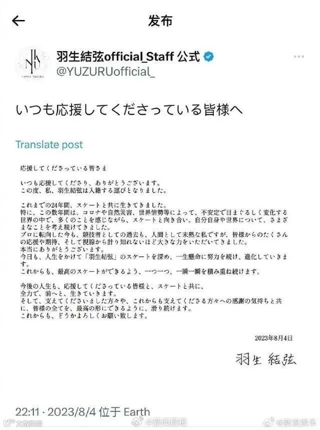 此前,2023年8月4日晚,日本花样滑冰名将羽生结弦忽然通过工作室发文宣布结婚,并称:“在今后的人生中,我也会和支持我的大家一起,和滑冰一起,全力前进。”