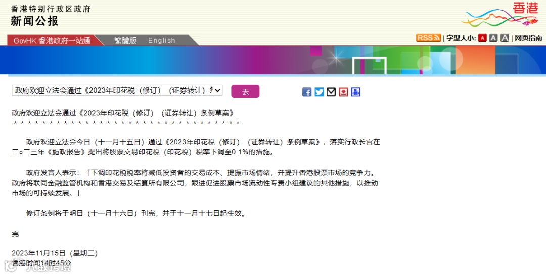 11月15日,香港特区政府立法会通过《2023年印花税(修订)(证券转让)条例草案》(简称“条例草案”),将港股股票交易印花税税率下调至0.1%,并于11月17日(周五)起生效。