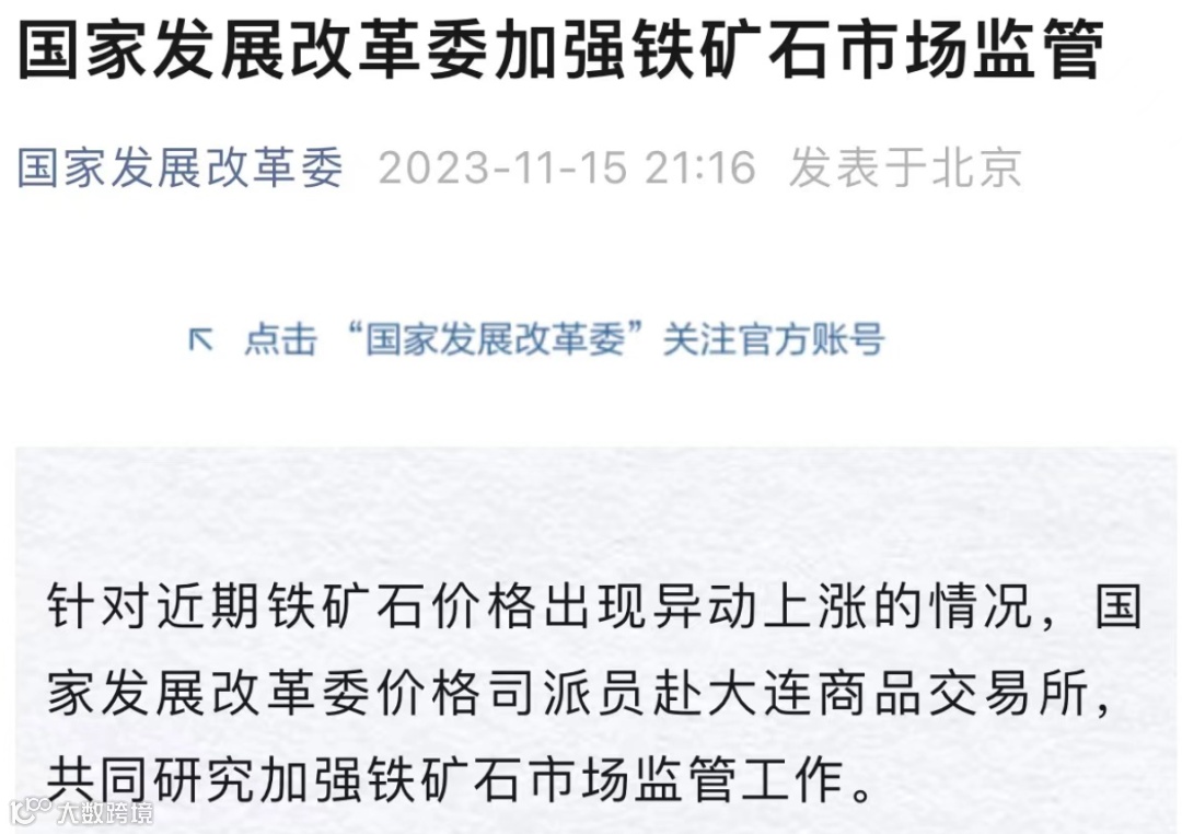 11月15日晚间,国家发改委官方微信公众号消息,针对近期铁矿石价格出现异动上涨的情况,国家发展改革委价格司派员赴大连商品交易所,共同研究加强铁矿石市场监管工作。