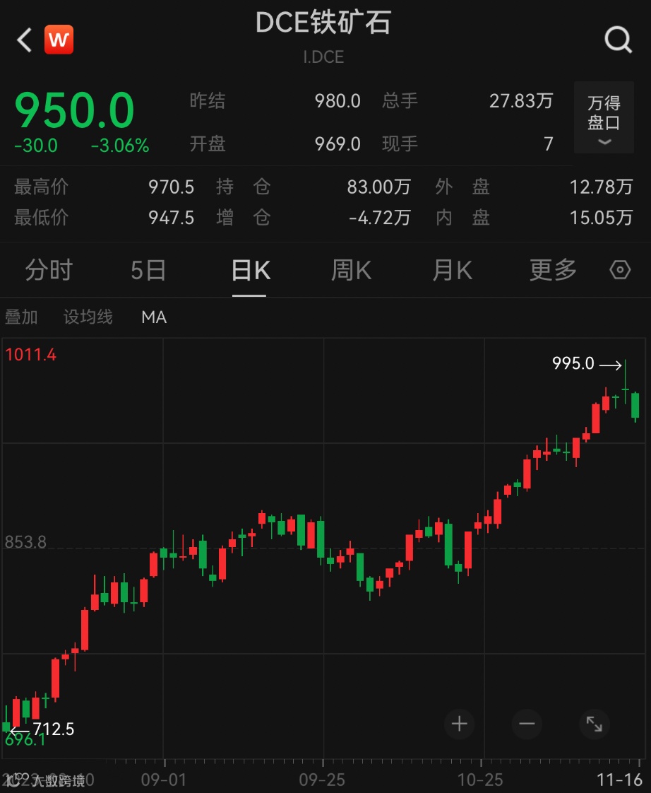 在此之前,铁矿石期货价格持续上涨,11月15日一度创出995元/吨的高点,相较于今年5月低点,累计涨幅达50%。