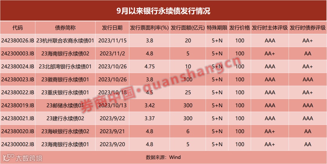 在其他银行永续债方面,11月15日发行的23杭州联合农商永续债01、10月26日发行的23徽商银行永续债01的利率均为3.8%,利率要比泰康永续债高10BP;而相近时期发行永续债的地方银行,发债利率多在4.5%以上。