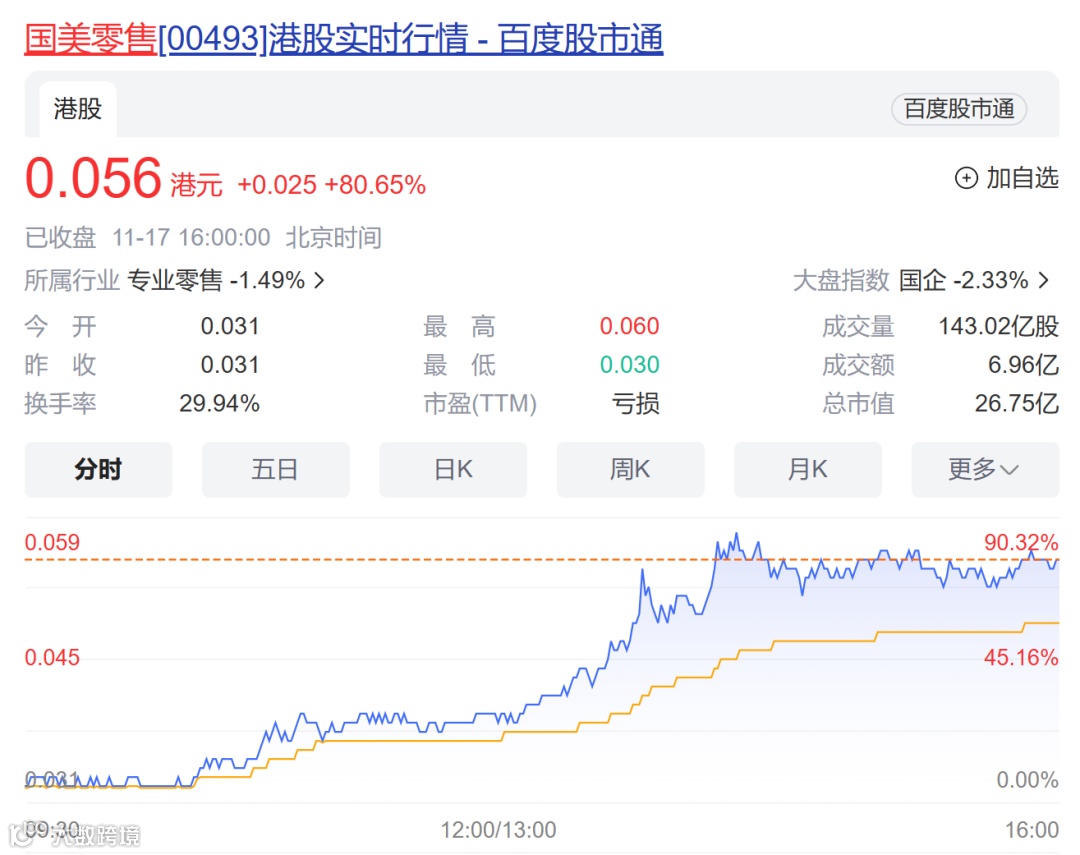 11月17日,昔日的零售巨头国美零售(00493.HK)股价出现大幅异动。尤其是午后,随着成交量急剧放大,该股股价大幅飙升,盘中涨超90%,创出近年来该股单日涨幅最高纪录,最终收盘涨80.65%,报收0.056港元每股,成交量143亿股,换手率近30%。