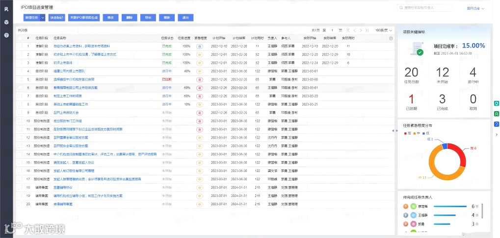 进入整改提升与申报推进阶段,任务多、链条长、跨部门协同重,容易出现事项散落、节点靠人盯、整改缺少闭环。IPO项目管理将上市实操流程固化为可执行的项目工作台:内置IPO事项库,将事项指引、法规要点、常用材料模版集中沉淀,可快速生成项目计划并明确责任人、节点与交付物。进度管理支持任务创建、推进、状态标记与关键指标统计,实时呈现完成率与风险预警。主题分析与自查发现的问题可直接流转为整改清单并拆解为任务,做到责任到人、按期验收、资料归档。项目推进因此更规范、更透明、更可控。