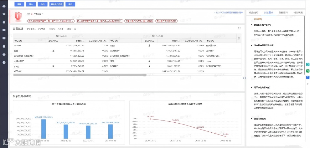 进入辅导与申报准备阶段,企业问题常常卡在问询重点不清、资料口径对不上、缺陷临近上会才集中暴露。IPO主题分析以审核问询视角搭建分析框架,聚焦资产、负债、收入、成本费用、内控、关联交易六大主题;依托公司业财数据、行业数据、上市公司财报、IPO案例库与法规库,智能合规引擎可自动生成主题看板与32+合规分析报表,完成风险扫描、异常提示与关注点定位。每条风险可关联概念说明、关注重点、备查资料与相关法规,沉淀为风险标签与整改线索,将风险识别与证据链准备前置到日常。