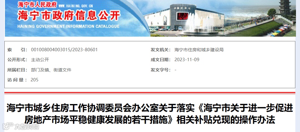 11月9日,海宁市发布关于落实《海宁市关于进一步促进房地产市场平稳健康发展的若干措施》相关补贴兑现的操作办法,包括《海宁市扩面人才购房补贴操作办法》《海宁市关于企业或员工团购新建商品房购房补贴的操作办法》《海宁市关于房地产企业购买存量房财政补贴的操作办法》《海宁市二孩、三孩家庭购房补贴操作办法》4个操作办法。