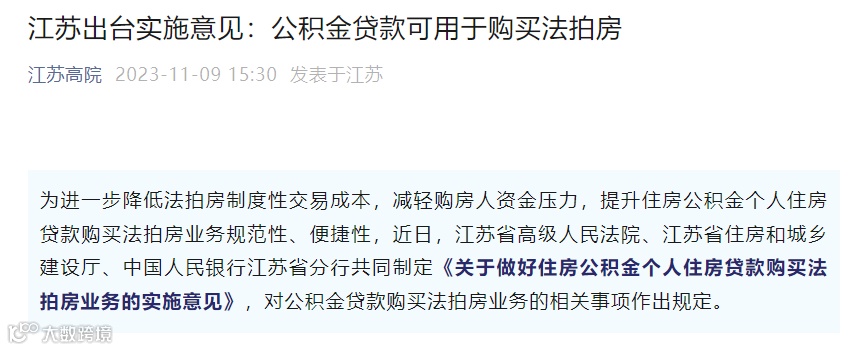 11月9日,江苏省高级人民法院发文提出,符合住房公积金个人住房贷款条件的法拍房买受人,可在未付清全款前办理住房公积金个人住房贷款。
