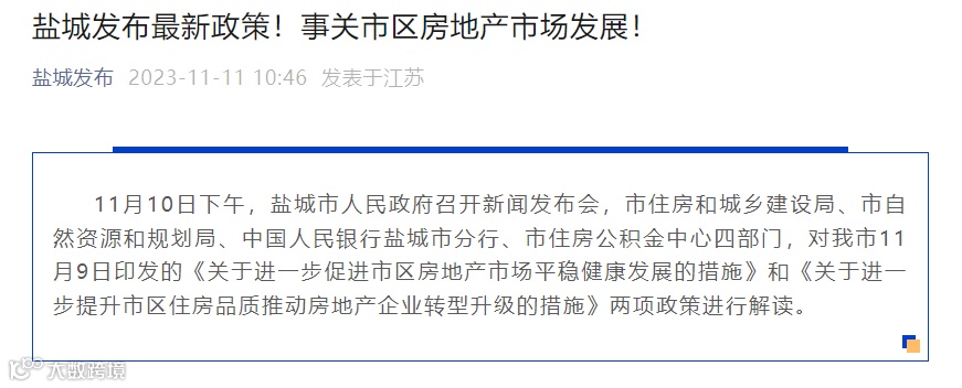 11月11日,据“盐城发布”公众号消息,盐城日前印发的《关于进一步促进市区房地产市场平稳健康发展的措施》和《关于进一步提升市区住房品质推动房地产企业转型升级的措施》两项政策。
