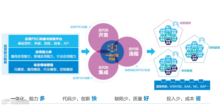 充分利用新技术能力和可组装架构,以金蝶独创的动态领域模型为基础,将金蝶近30年的企业应用构建和客户服务经验沉淀形成丰富的应用能力库,为企业打造应用能力构建与组装平台, 通过低代码开发、流程和集成等能力来支撑不同场景下构建与组装,助力企业可组装应用建设得多、快、好、省。