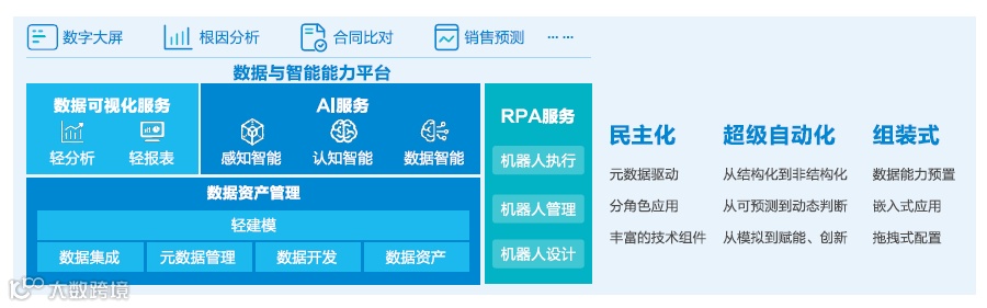 ● 数据与智能平台:以数据编织、AI为核心技术,支持数据能力构建与组装,实现智周万物。如今的企业竞争差异化很多时候体现在数智能力的不同。数智化能力越强的公司,决策越精准,可以对大数据更快地分析和决策,可以应用更多的数字员工,并把更多繁琐的业务交给机器人执行,通过认知感知、数据智能和数据算法,把数据资产转化为很好的业务模型,通过这些引擎,让企业的决策更精准、更科学。