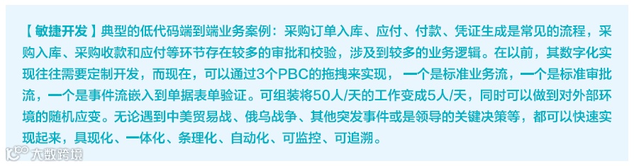低代码是当前比较热门的话题。低代码不仅仅可以应用于表单,也可以应用于进入园区的扫描、财经项目的管理、智能经费的报销流程、几个系统联用打通等。实现敏捷和低代码,不仅仅是开发几个低代码的拖拉拽小工具,而是需要构建一个强大的应用PBC库,同时要有能力组装起来。